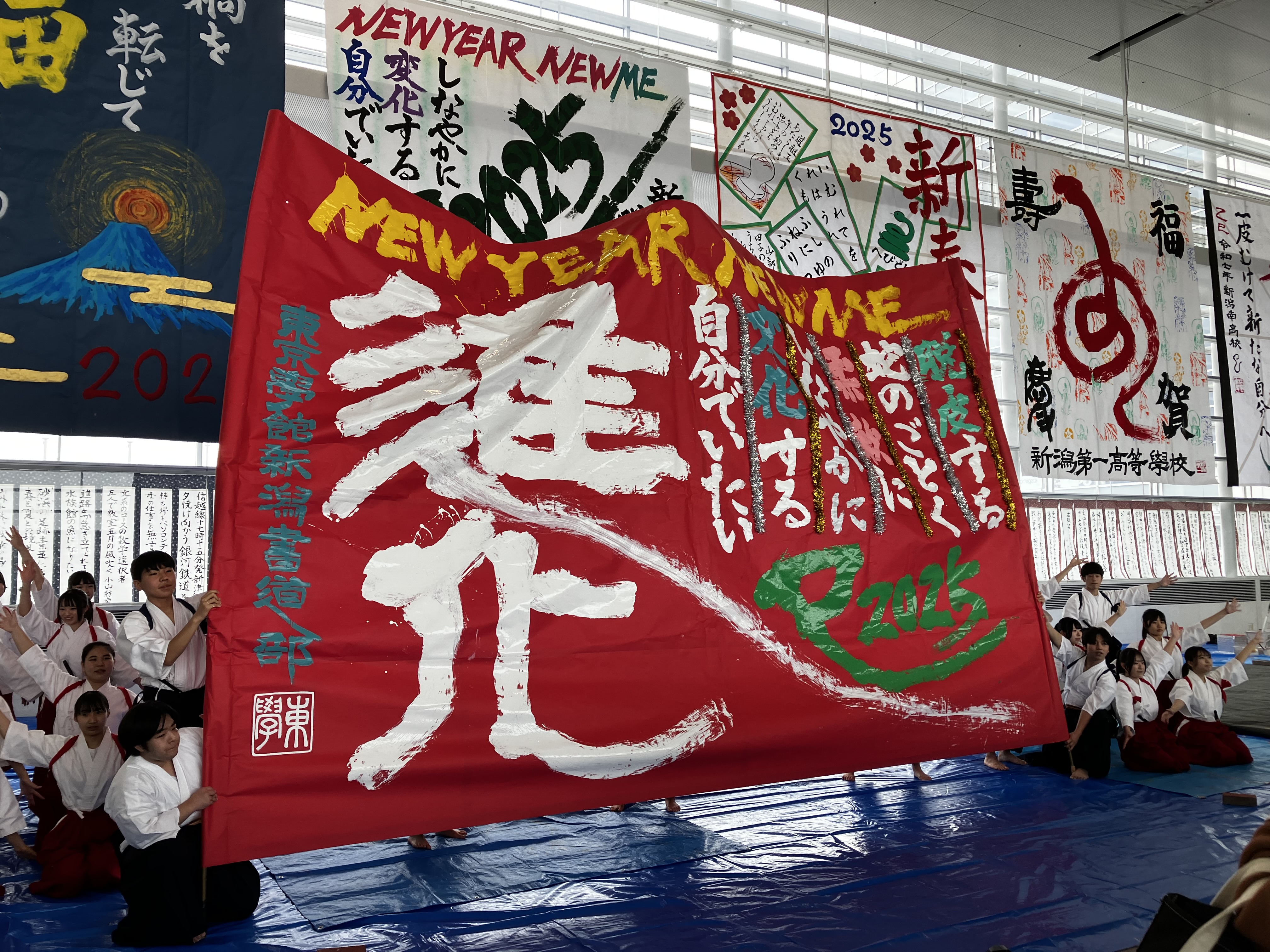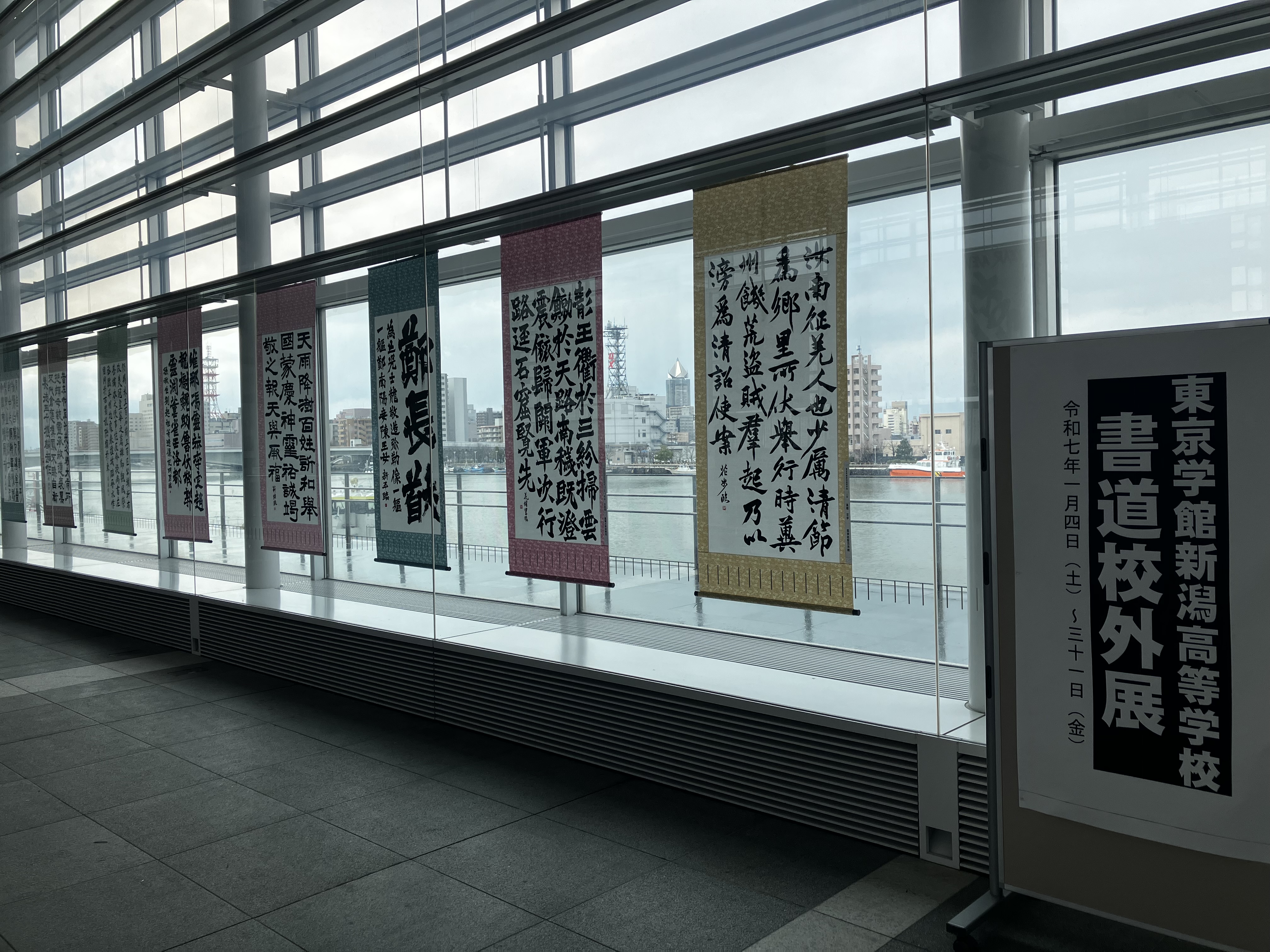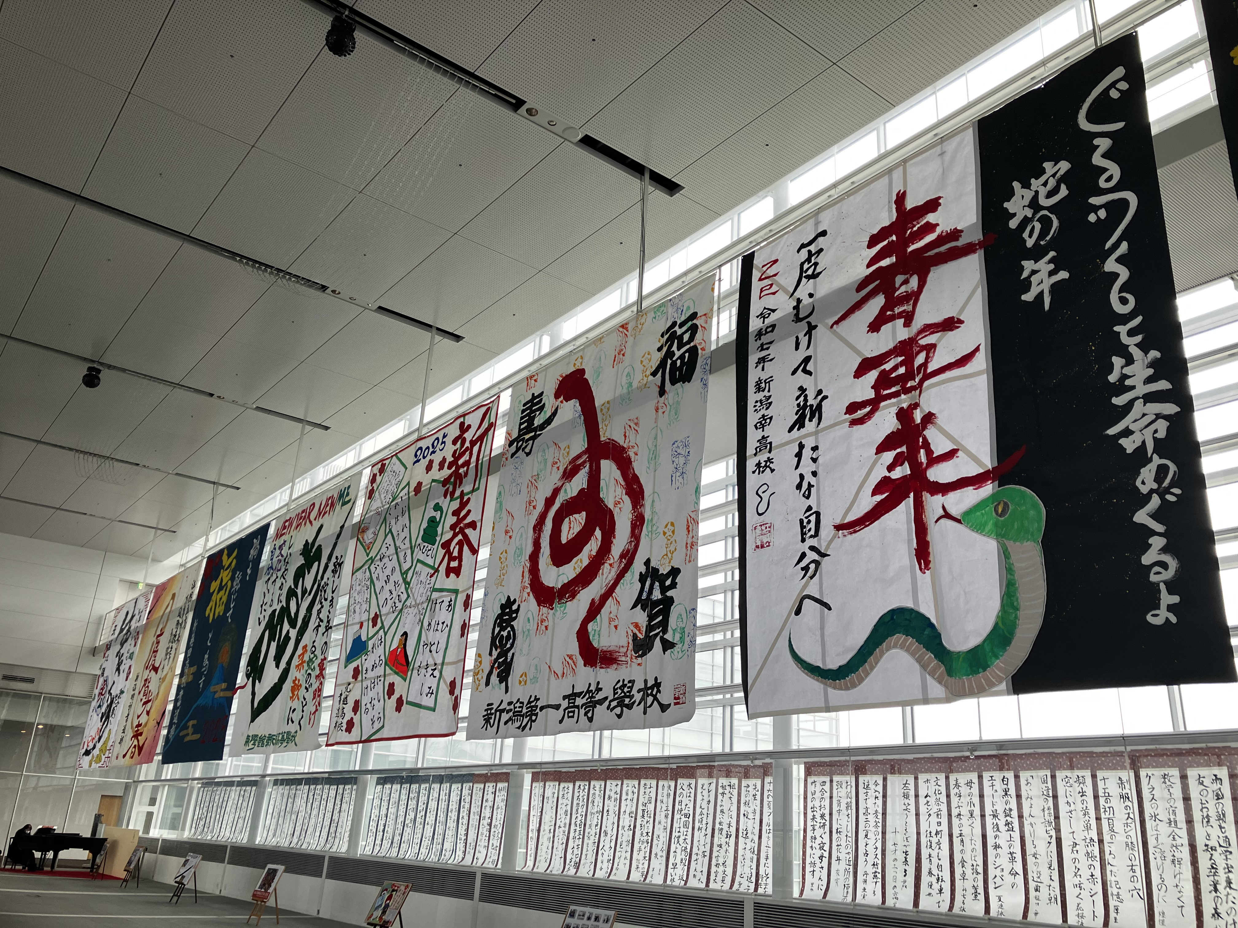 県内7高校の書道部の皆さんが制作した大型書道作品が、朱鷺メッセ2Fアトリウムに!